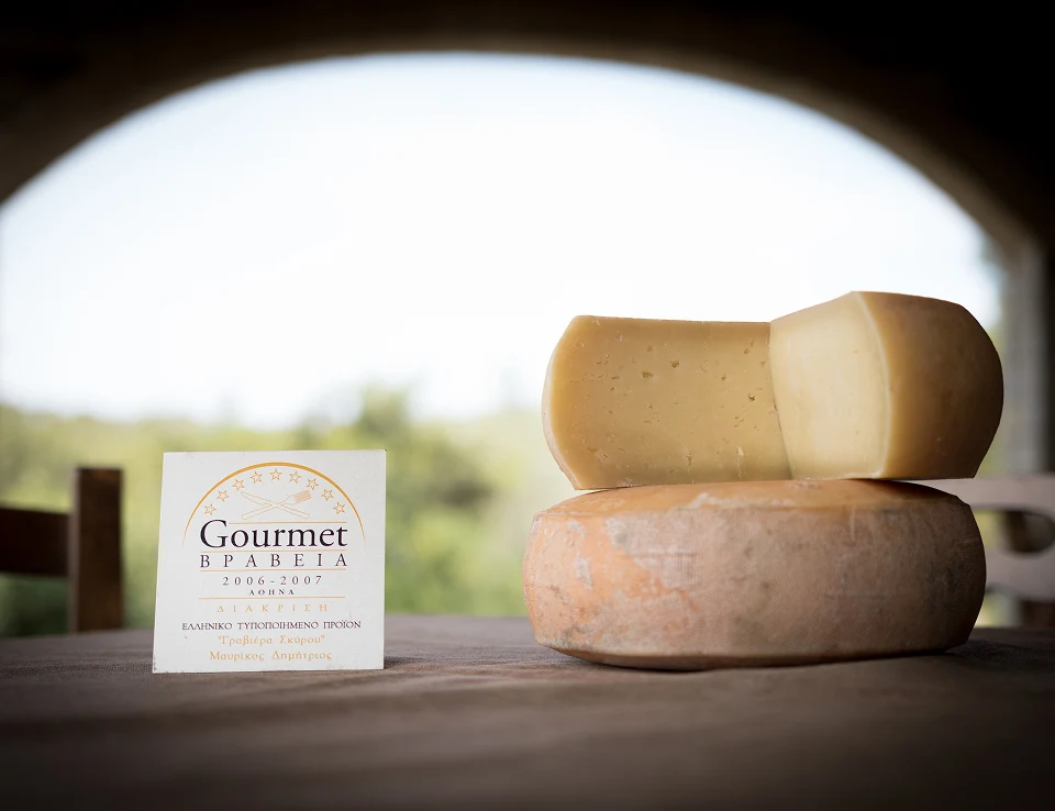 Η Σκυριανή Γραβιέρα του Τάκου (Δημήτρη Μαυρίκου) έχει αποσπάσει σημαντικές διακρίσεις για την ποιότητά της, όπως το βραβείο Gourmet 2006-2007 για την αυθεντική γεύση και υφή της, καθώς και το Platinum Specialist Award 2023 για την εκλεκτή "Πυθαρισία Σκυριανή Γραβιέρα". Επιπλέον, διακρίθηκε με το Gourmet 2022-2023, επιβεβαιώνοντας τη σταθερή υπεροχή της στον γαστρονομικό χάρτη, ενώ πρόσφατα τιμήθηκε με το Silver Specialist Award 2025, αναγνωρίζοντας την προσήλωση στην ποιότητα και την παραδοσιακή τυροκομική τέχνη. Αυτά τα βραβεία αναδεικνύουν τη διαχρονική αφοσίωση στην αυθεντικότητα και την τέχνη πολλών γενεών, επιβεβαιώνοντας τη θέση της ως κορυφαίο προϊόν της σκυριανής γαστρονομίας.